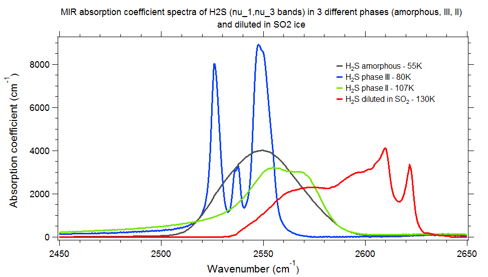 - Schmitt, Bernard (1991): MIR absorption coefficient spectra of H2S (nu_1,nu_3 bands) in 3 different phases (amorphous, III, II) and diluted in SO2 ice. SSHADE/GhoSST (OSUG Data Center). Dataset/Spectral Data. https://doi.org/10.26302/SSHADE/EXPERIMENT_BS_20200202_001