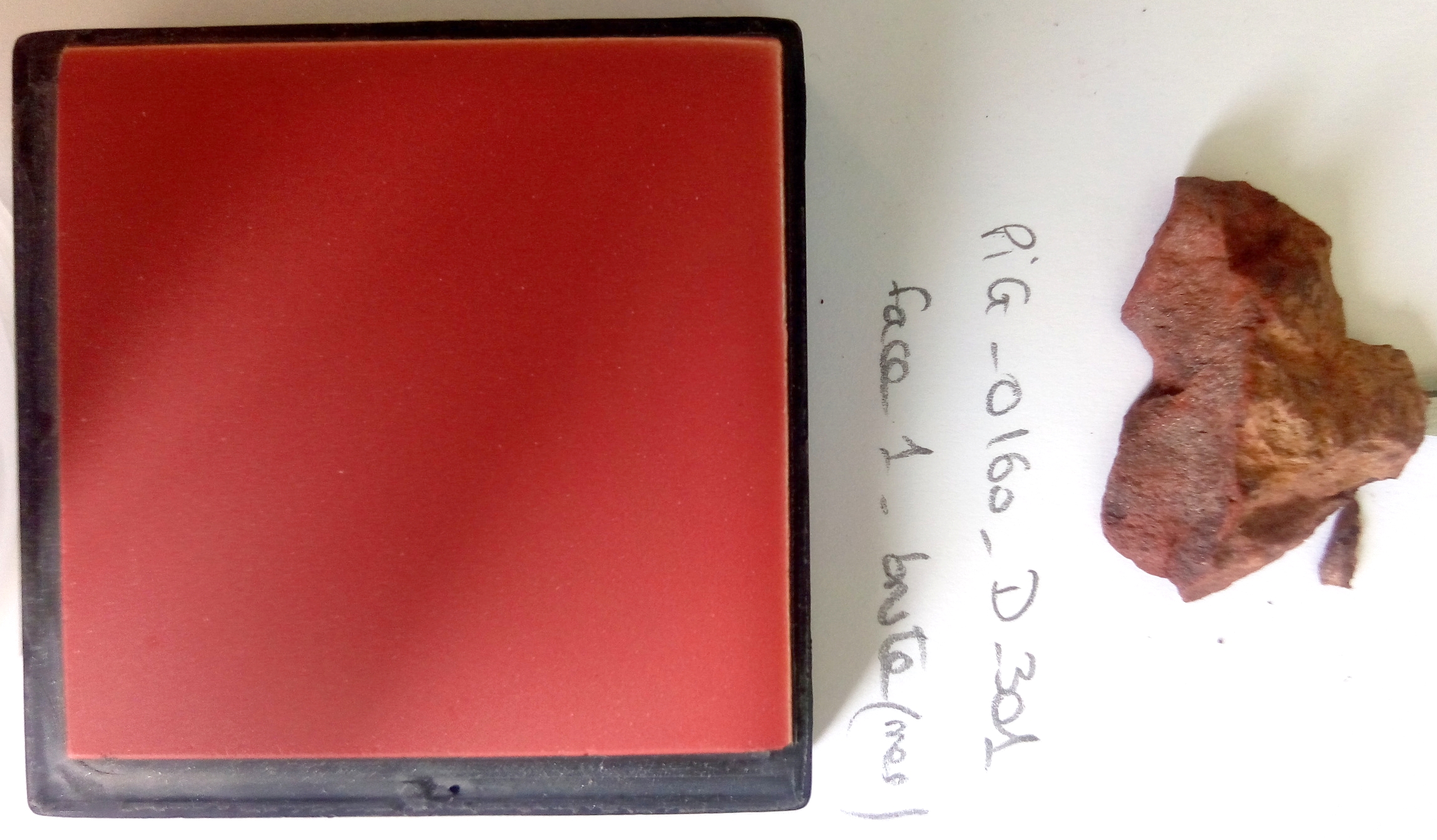- Irregular shaped red-bordeaux block with approximate size 30x21mm with one sawn face (face #1), one main red-grey face (face #2)