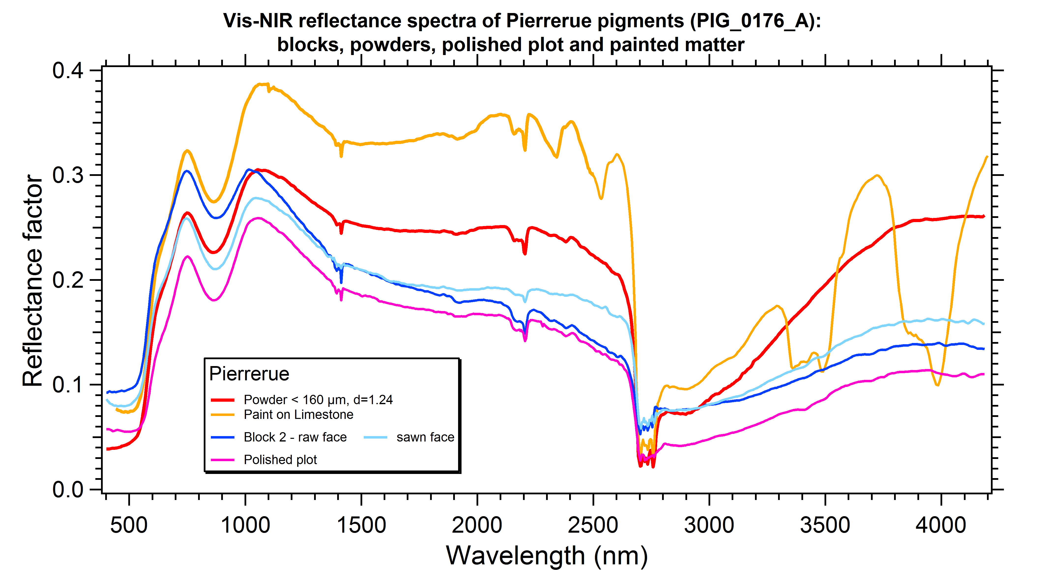 - Vis-NIR reflectance spectra of Pierrerue pigments (PIG_0176_A) 1 raw blocks and 1 sawn (2 faces each), as powders with grain sizes < 160 µm (2 densities: 1.24 and 1.33), as a polished plot, and a painted matter on limestone