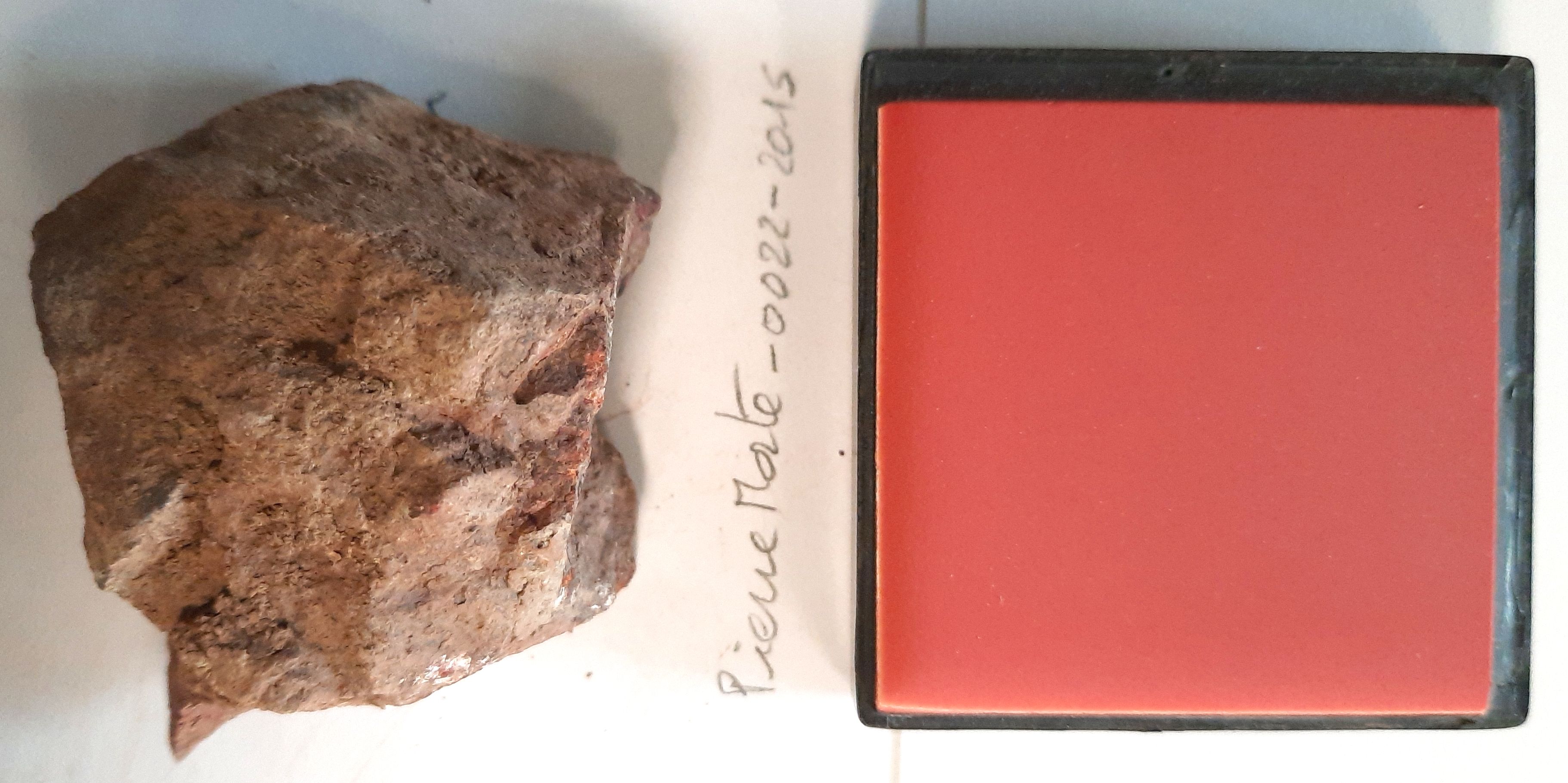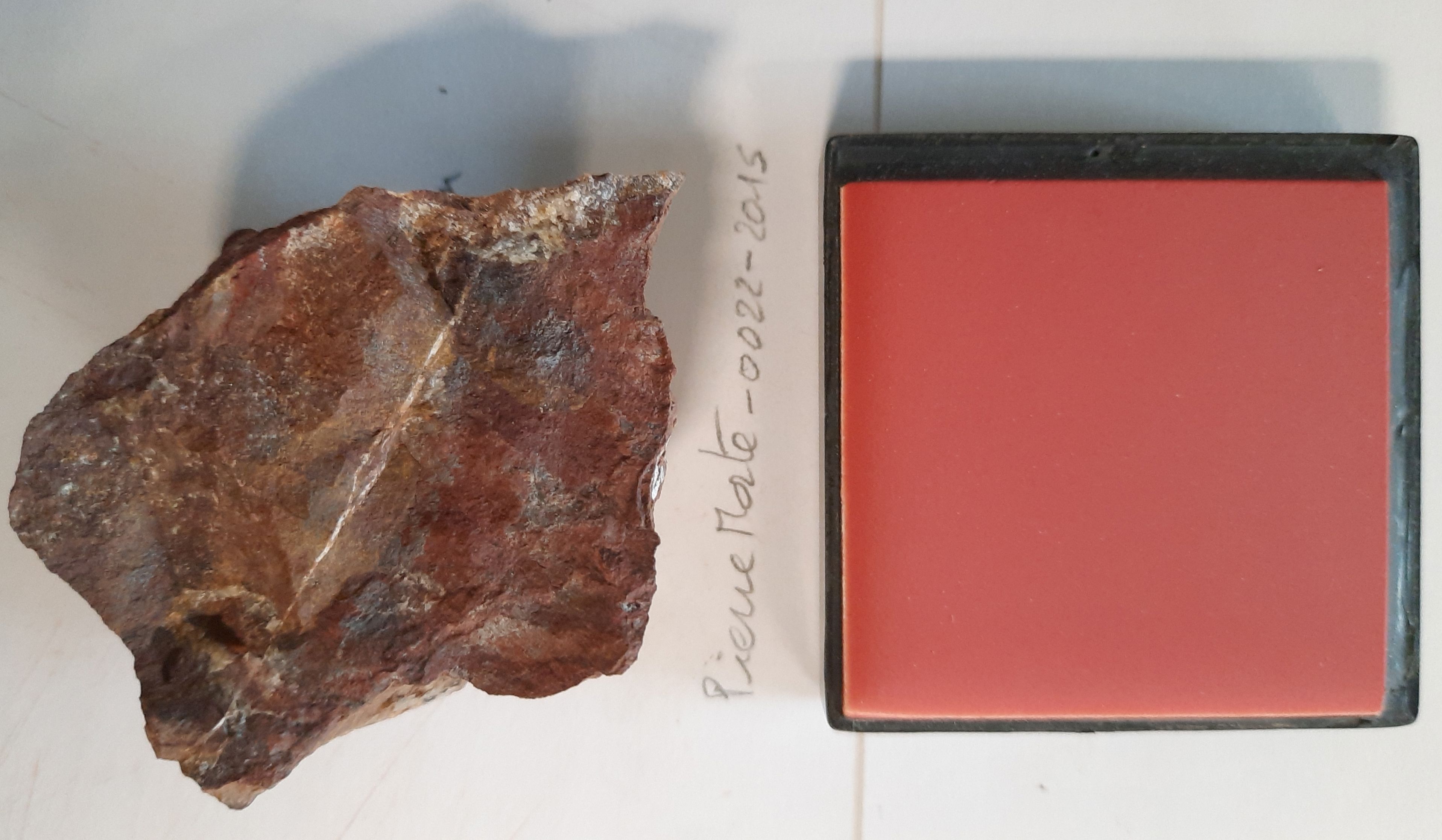 - large red irregular block (55x50x27 mm) with two fractured faces with red, yellow-grey and grey zones (face #1), the others are brown-grey inlaid faces (face #3+)