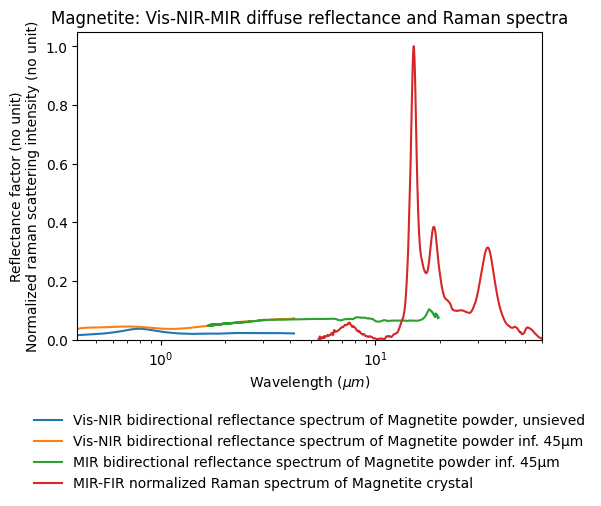 - Schmitt, Bernard (2021): Magnetite: Vis-NIR-MIR diffuse reflectance and Raman spectra. SSHADE/DRIMS (OSUG Data Center). Dataset/Spectral Data. https://doi.org/10.26302/SSHADE/EXPERIMENT_BS_20250903_001