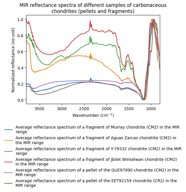 - MIR reflectance spectra of different samples of carbonaceous chondrites (pellets and fragments)