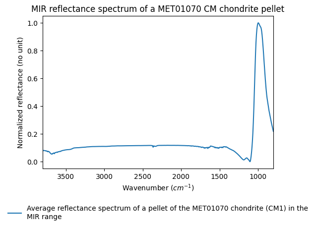 - Average MIR reflectance spectrum of a pellet of QUE97990 CM chondrite, obtained by hyperspectral imaging