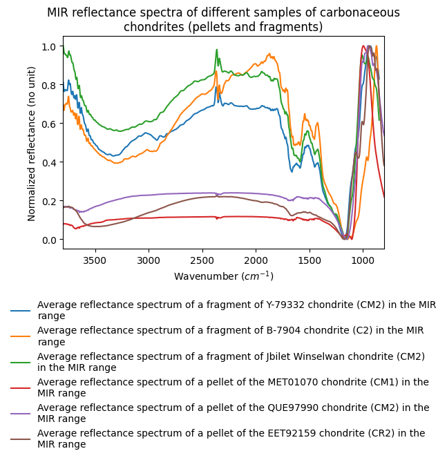 - MIR reflectance spectra of different samples of carbonaceous chondrites (pellets and fragments)