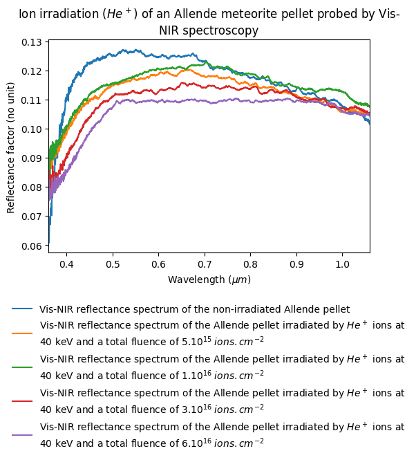 - Lantz, Cateline (2015): Ion irradiation ($He^+$) of an Allende meteorite pellet probed by Vis-NIR spectroscopy. SSHADE/DAYSY (OSUG Data Center). Dataset/Spectral Data. https://doi.org/10.26302/SSHADE/EXPERIMENT_CL_20181201_01