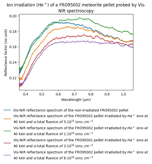 - Lantz, Cateline (2015): Ion irradiation ($He^+$) of a FRO95002 meteorite pellet probed by Vis-NIR spectroscopy. SSHADE/DAYSY (OSUG Data Center). Dataset/Spectral Data. https://doi.org/10.26302/SSHADE/EXPERIMENT_CL_20181201_02