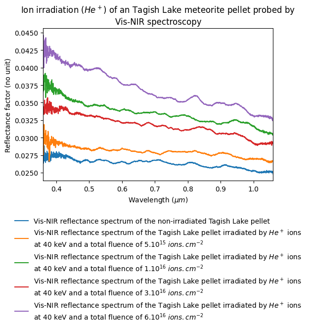 Vis-NIR spectra of Tagish Lake meteorite pellet, before and after ion irradiation at different doses.