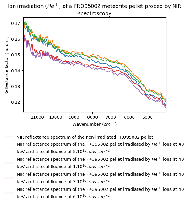 - NIR spectra of FRO95002 meteorite pellet, before and after ion irradiation at different doses.