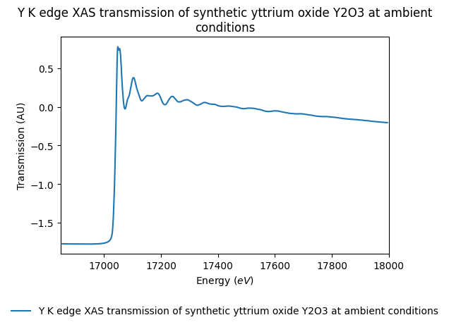 Min - Max ($eV$) Sampling ($eV$) Resolution ($eV$) Position accuracy ($eV$) Absorption edge #1 16848.0 - 18000.0 0.874 $Y$ (K: 17.0384 $keV$) - Comments
