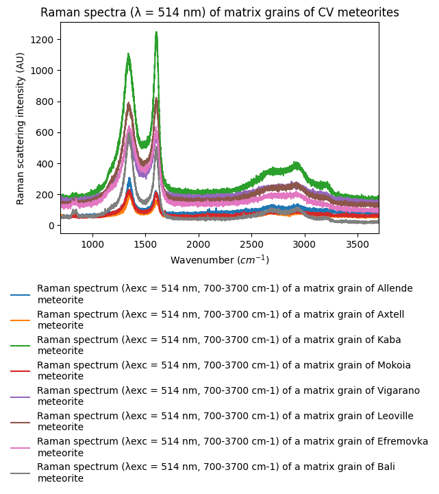 - Bonal, Lydie (2003): Raman spectra (λ = 514 nm) of matrix grains of CV meteorites. SSHADE/GhoSST (OSUG Data Center). Dataset/Spectral Data. https://doi.org/10.26302/SSHADE/EXPERIMENT_LB_20140114_001