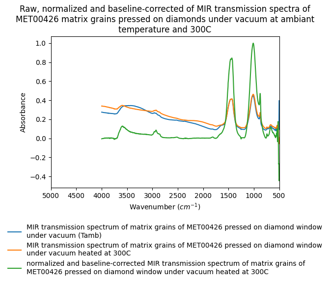 - Raw, normalized and baseline-corrected of MIR transmission spectra of MET00426 matrix grains pressed on diamonds under vacuum at ambiant temperature and 300C