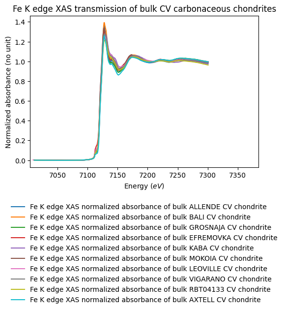 - Garenne, Alexandre; Bonal, Lydie; Beck, Pierre; Proux, Olivier (2013): Fe K edge XAS transmission of bulk CV carbonaceous chondrites. SSHADE/GhoSST+FAME (OSUG Data Center). Dataset/Spectral Data. https://doi.org/10.26302/SSHADE/EXPERIMENT_LB_20191211_005