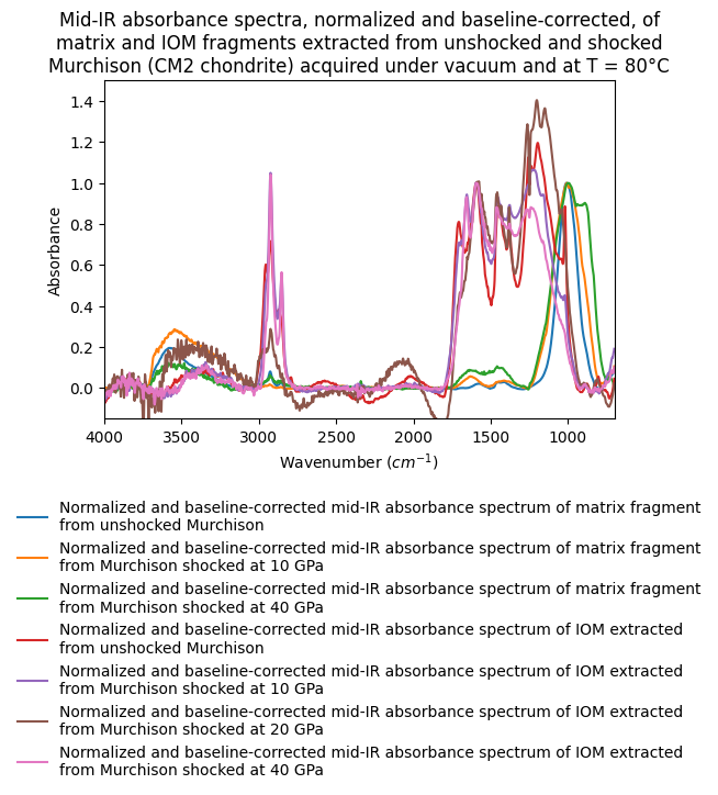 - Normalized Mid-IR absorbance spectra (baseline corrected) of matrix and IOM fragments extracted from unshocked and shocked (at 5, 10, 20 and 40 GPa) Murchison (CM2 chondrite) acquired under vacuum and at T = 80°C