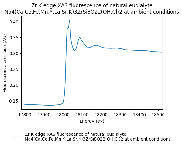 - Zr K edge XAS fluorescence of natural eudialyte Na4(Ca,Ce,Fe,Mn,Y,La,Sr,K)3ZrSi8O22(OH,Cl)2 at ambient conditions