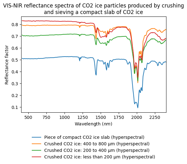 - The VIS-NIR reflectance spectrum of a piece of compact CO2 ice slab (commercial sample) was measured as well as the spectra of different particle size fractions of crushed CO2 ice produced by crushing the compact ice and dry sieving the powder. Vis multispectral + NIR low resolution and Vis-NIR high resolution spectra.