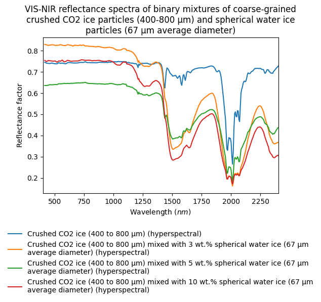- VIS-NIR reflectance spectra of binary mixtures of coarse-grained crushed CO2 ice particles (400-800 µm) and spherical water ice particles (67 µm average diameter)