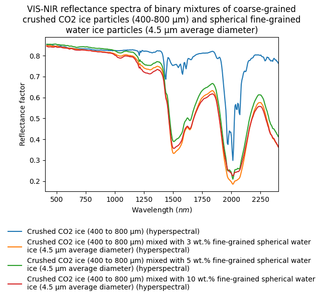 - VIS-NIR reflectance spectra of binary mixtures of coarse-grained crushed CO2 ice particles (400-800 µm) and spherical fine-grained water ice particles (4.5 µm average diameter)