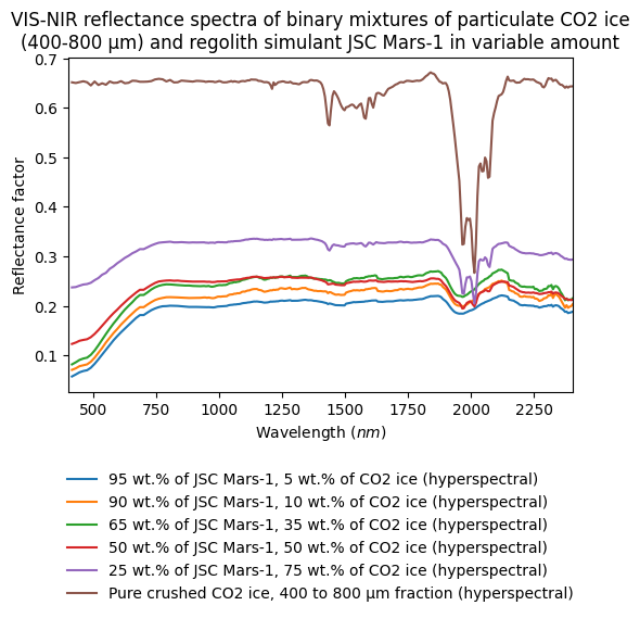 - Yoldi, Zuriñe (2018): VIS-NIR reflectance spectra of binary mixtures of particulate CO2 ice (400-800 µm) and regolith simulant JSC Mars-1 in variable amount. SSHADE/BYPASS (OSUG Data Center). Dataset/Spectral Data. https://doi.org/10.26302/SSHADE/EXPERIMENT_ZY_20180216_000