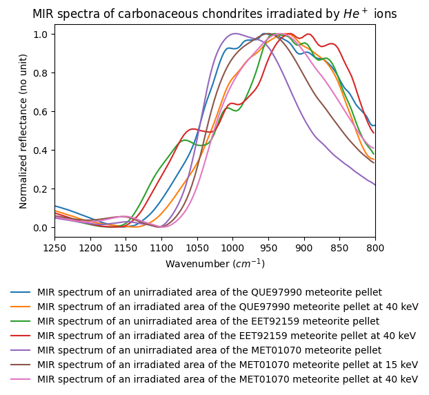 - Mid-IR spectra of carbonaceous chondrite pellets and chips: unirradiated area and area irradiated by $He^+$ ions at 4, 15, 20 and 40 keV and a total fluence of $6.10^{16} ions.cm{-2}$.