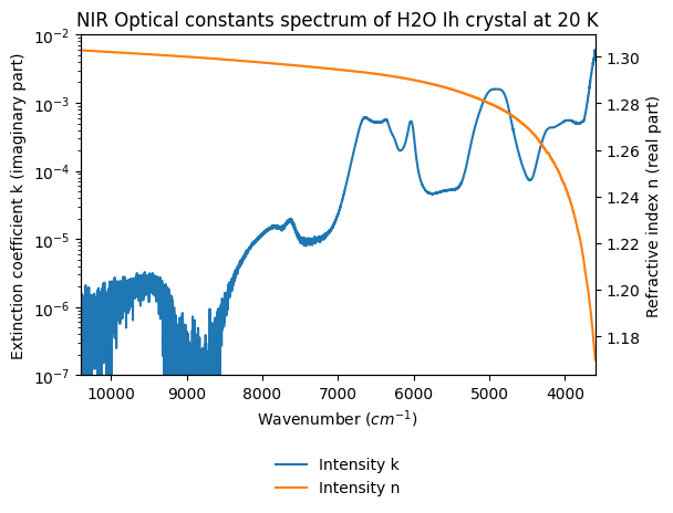 - Grundy, Will; Schmitt, Bernard (1997): NIR Optical constants spectrum of H2O Ih crystal and H2O liquid from 20 to 293 K. SSHADE/GhoSST (OSUG Data Center). Dataset/Spectral Data. https://doi.org/10.26302/SSHADE/EXPERIMENT_BS_20120924_011