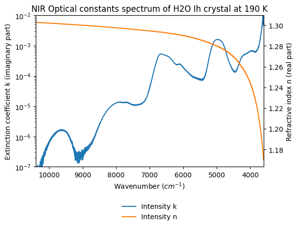 - Grundy, Will; Schmitt, Bernard (1997): NIR Optical constants spectrum of H2O Ih crystal and H2O liquid from 20 to 293 K. SSHADE/GhoSST (OSUG Data Center). Dataset/Spectral Data. https://doi.org/10.26302/SSHADE/EXPERIMENT_BS_20120924_011