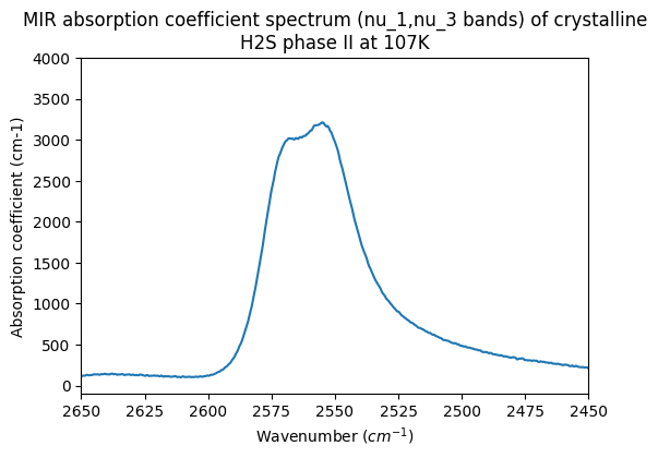MIR absorption coefficient spectrum (nu_1,nu_3 bands) of crystalline H2S phase II at 107K
