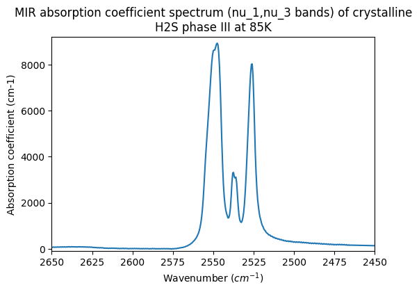 - Schmitt, Bernard (1991): MIR absorption coefficient spectra of H2S (nu_1,nu_3 bands) in 3 different phases (amorphous, III, II) and diluted in SO2 ice. SSHADE/GhoSST (OSUG Data Center). Dataset/Spectral Data. https://doi.org/10.26302/SSHADE/EXPERIMENT_BS_20200202_001
