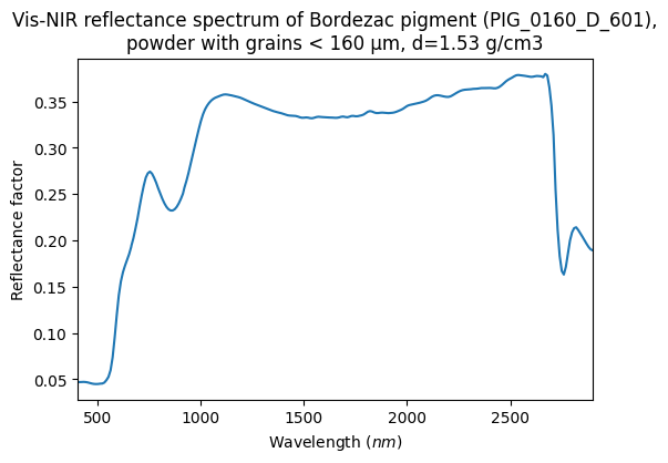 - Schmitt, Bernard; Chalmin-Aljanabi, Emilie; Chassin de Kergommeaux, Aurélie (2019): Vis-NIR reflectance spectra of Bordezac pigments (Pig_0160_D): blocks, powders, plots and painted matters. SSHADE/PIG (OSUG Data Center). Dataset/Spectral Data. https://doi.org/10.26302/SSHADE/EXPERIMENT_BS_20200422_100