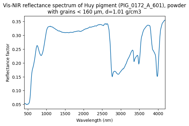 - Schmitt, Bernard; Chalmin-Aljanabi, Emilie; Chassin de Kergommeaux, Aurélie (2019): Vis-NIR reflectance spectra of Huy pigments (PIG_0172_A): blocks, powders, plots and painted matters. SSHADE/PIG (OSUG Data Center). Dataset/Spectral Data. https://doi.org/10.26302/SSHADE/EXPERIMENT_BS_20200813_100