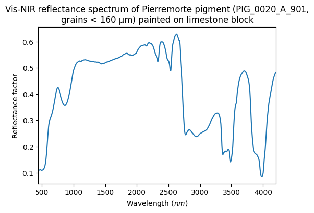 - Schmitt, Bernard; Chalmin-Aljanabi, Emilie (2019): Vis-NIR reflectance spectra of Pierremorte pigments (PIG_0020_A and B): blocks, powders, polished plot and painted matters. SSHADE/PIG (OSUG Data Center). Dataset/Spectral Data. https://doi.org/10.26302/SSHADE/EXPERIMENT_BS_20200815_100