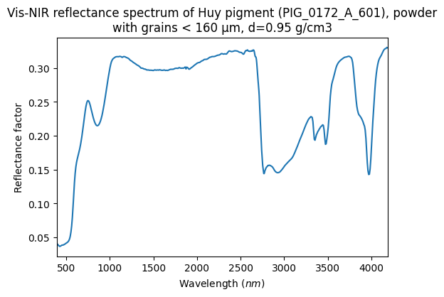 Vis-NIR reflectance spectrum of Huy pigment (PIG_0172_A_601), powder with grains < 160 µm, d=0.95 g/cm3