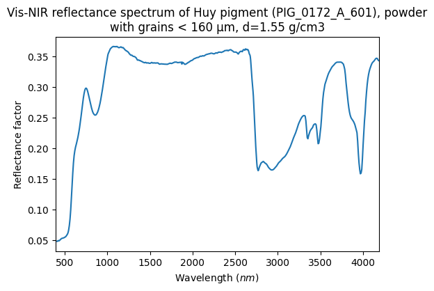 Vis-NIR reflectance spectrum of Huy pigment (PIG_0172_A_601), powder with grains < 160 µm, d=1.55 g/cm3