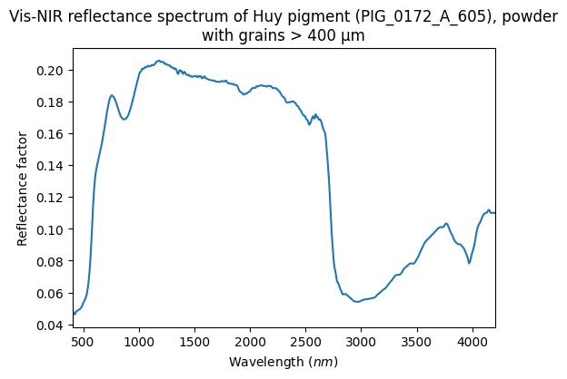 Vis-NIR reflectance spectrum of Huy pigment (PIG_0172_A_605), powder with grains > 400 µm
