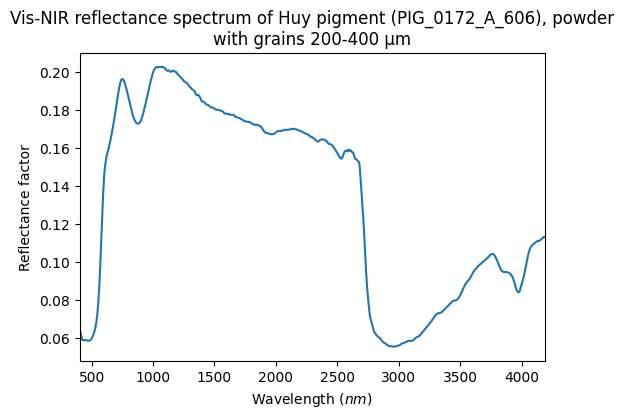 - Schmitt, Bernard; Chalmin-Aljanabi, Emilie; Chassin de Kergommeaux, Aurélie (2019): Vis-NIR reflectance spectra of Huy pigments (PIG_0172_A): blocks, powders, plots and painted matters. SSHADE/PIG (OSUG Data Center). Dataset/Spectral Data. https://doi.org/10.26302/SSHADE/EXPERIMENT_BS_20200813_100