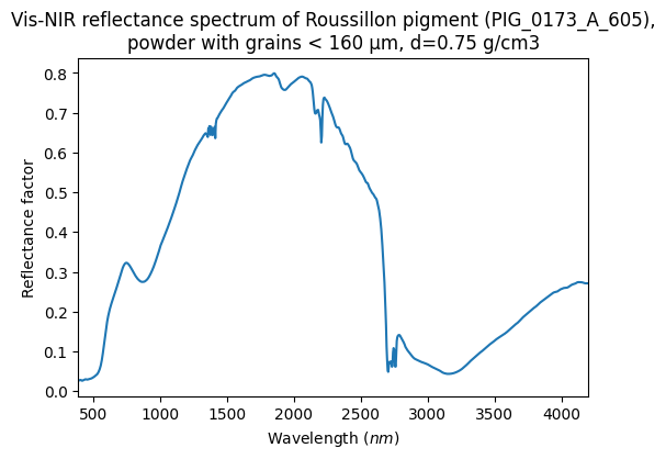 Vis-NIR reflectance spectrum of Roussillon pigment (PIG_0173_A_605), powder with grains < 160 µm, d=0.75 g/cm3