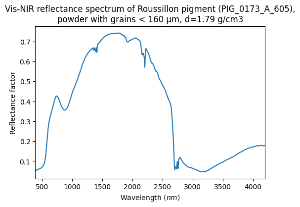 - Schmitt, Bernard; Chalmin-Aljanabi, Emilie; Chassin de Kergommeaux, Aurélie (2019): Vis-NIR reflectance spectra of Roussillon pigments (PIG_0173_A): raw blocks, powders with different grain sizes and painted matter. SSHADE/PIG (OSUG Data Center). Dataset/Spectral Data. https://doi.org/10.26302/SSHADE/EXPERIMENT_BS_20191012_400