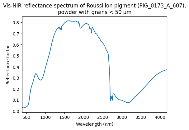 Vis-NIR reflectance spectrum of Roussillon pigment (PIG_0173_A_607), powder with grains < 50 µm