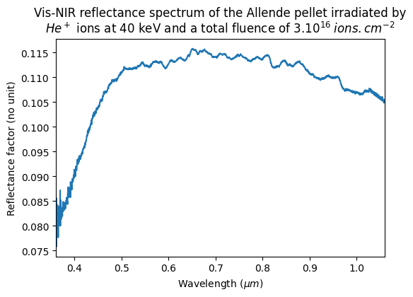 - Lantz, Cateline (2015): Ion irradiation ($He^+$) of an Allende meteorite pellet probed by Vis-NIR spectroscopy. SSHADE/DAYSY (OSUG Data Center). Dataset/Spectral Data. https://doi.org/10.26302/SSHADE/EXPERIMENT_CL_20181201_01