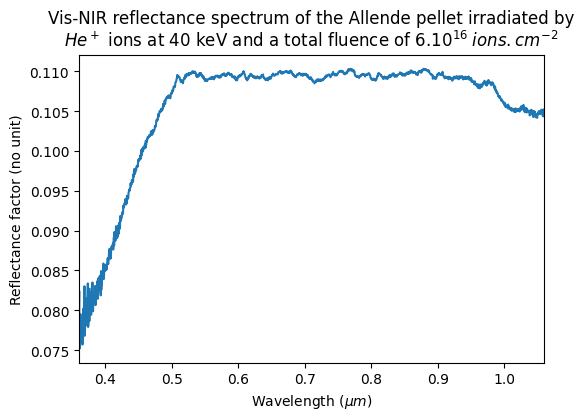 Vis-NIR reflectance spectrum of the Allende pellet irradiated by He⁺ ions at 40 keV and a total fluence of 6.1016 ions.cm-2
