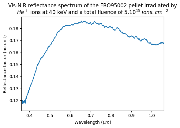 Vis-NIR reflectance spectrum of the FRO95002 pellet irradiated by He⁺ ions at 40 keV and a total fluence of 5.1015 ions.cm-2