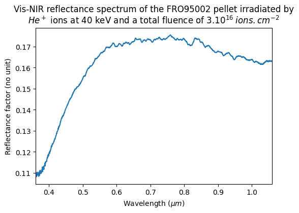 - Lantz, Cateline (2015): Ion irradiation ($He^+$) of a FRO95002 meteorite pellet probed by Vis-NIR spectroscopy. SSHADE/DAYSY (OSUG Data Center). Dataset/Spectral Data. https://doi.org/10.26302/SSHADE/EXPERIMENT_CL_20181201_02