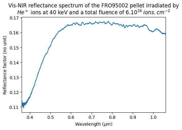 Vis-NIR reflectance spectrum of the FRO95002 pellet irradiated by He⁺ ions at 40 keV and a total fluence of 6.1016 ions.cm-2