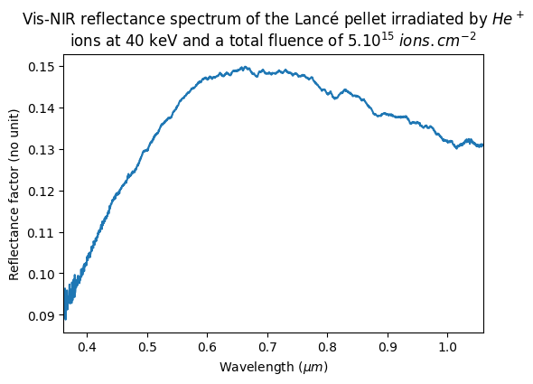 Vis-NIR reflectance spectrum of the Lancé pellet irradiated by He⁺ ions at 40 keV and a total fluence of 5.1015 ions.cm-2