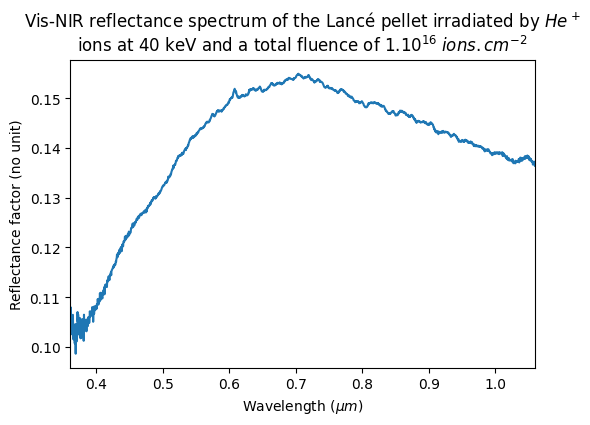 - Lantz, Cateline (2015): Ion irradiation ($He^+$) of a Lancé meteorite pellet probed by Vis-NIR spectroscopy. SSHADE/DAYSY (OSUG Data Center). Dataset/Spectral Data. https://doi.org/10.26302/SSHADE/EXPERIMENT_CL_20181201_03