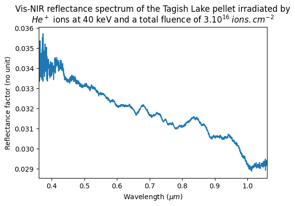 Vis-NIR reflectance spectrum of the Tagish Lake pellet irradiated by He⁺ ions at 40 keV and a total fluence of 3.1016 ions.cm-2
