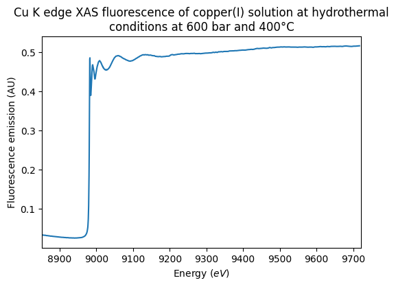 Cu K edge XAS fluorescence of copper(I) solution at hydrothermal conditions at 600 bar and 400°C