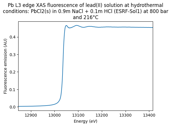 Pb L3 edge XAS fluorescence of lead(II) solution at hydrothermal conditions: PbCl2(s) in 0.9m NaCl + 0.1m HCl (ESRF-Sol1) at 800 bar and 216°C