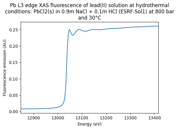 Pb L3 edge XAS fluorescence of lead(II) solution at hydrothermal conditions: PbCl2(s) in 0.9m NaCl + 0.1m HCl (ESRF-Sol1) at 800 bar and 30°C