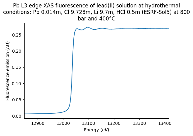 Pb L3 edge XAS fluorescence of lead(II) solution at hydrothermal conditions: Pb 0.014m, Cl 9.728m, Li 9.7m, HCl 0.5m (ESRF-Sol5) at 800 bar and 400°C