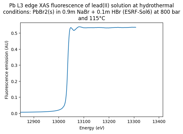 Pb L3 edge XAS fluorescence of lead(II) solution at hydrothermal conditions: PbBr2(s) in 0.9m NaBr + 0.1m HBr (ESRF-Sol6) at 800 bar and 115°C